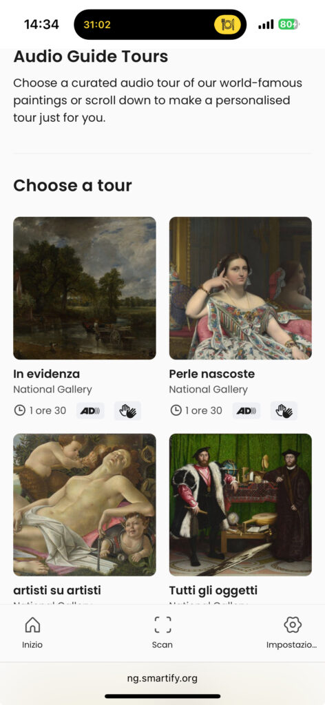 Tornando a Londra, vi segnalo comunque che alcuni musei offrono delle utilissime app per smartphone: ad esempio la National Gallery propone una webapp che oltre ad un’audio guida delle opere su alcuni percorsi predefiniti, fornisce una interessante funzione “scan” che permette di inquadrare qualsiasi opera live e ricevere un dettaglio e informazioni tramite pagine del sito del museo.